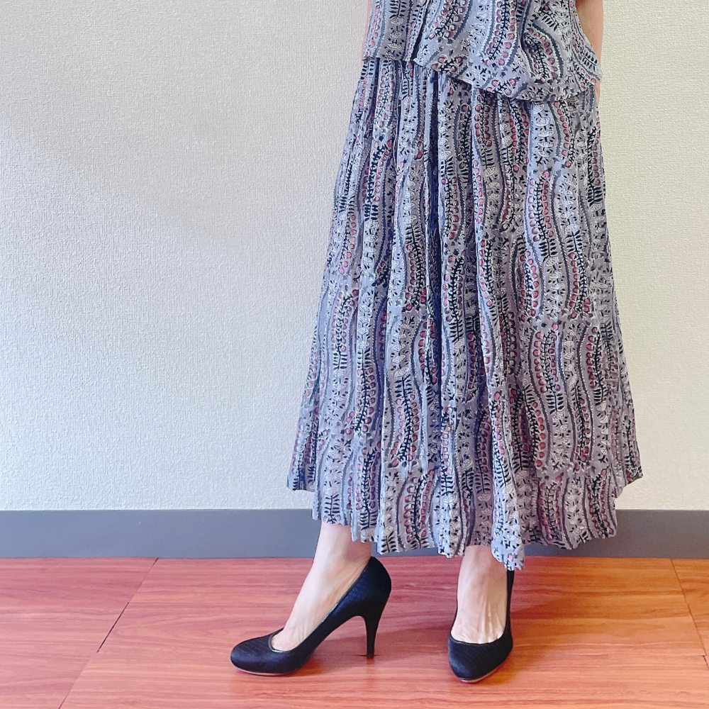 緻密なプリントが施されたスカートは、全面フレアーでヒップをゆったりと包み込んでくれるデザインで、動きやすさと通気性を兼ね備えています。