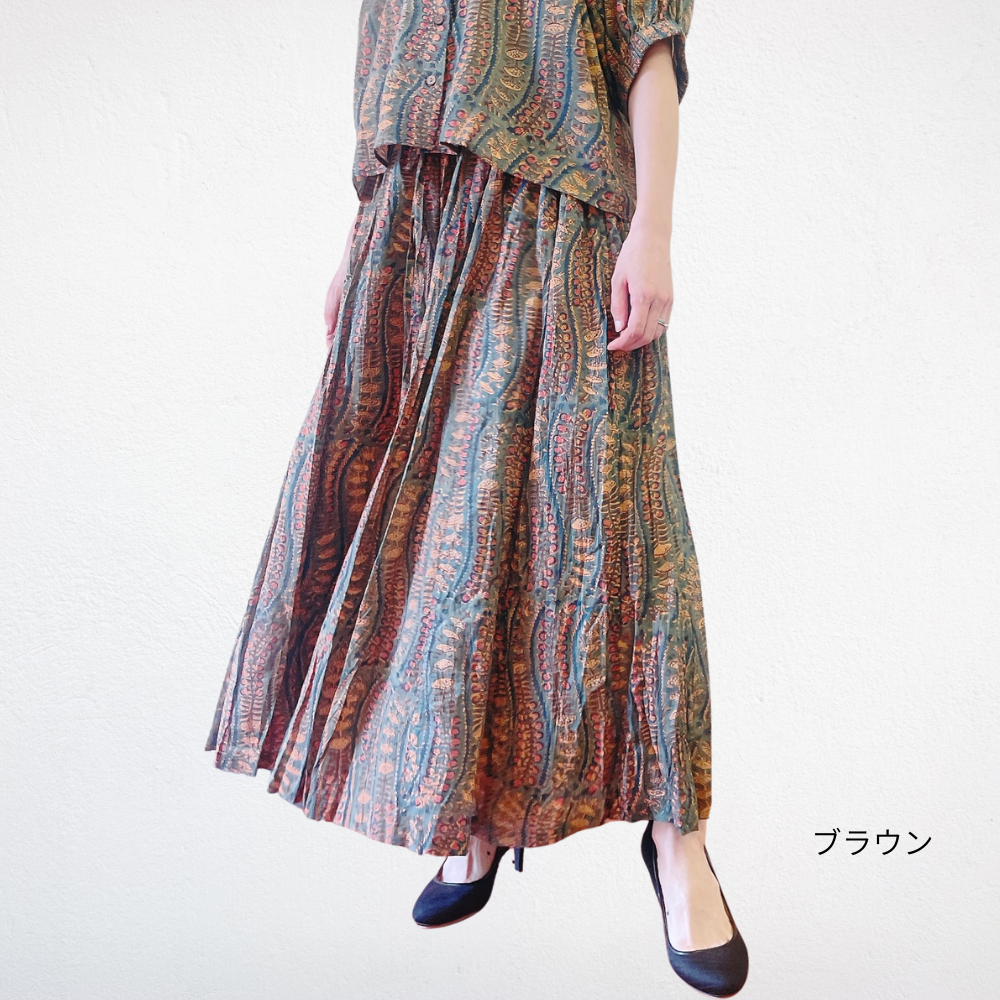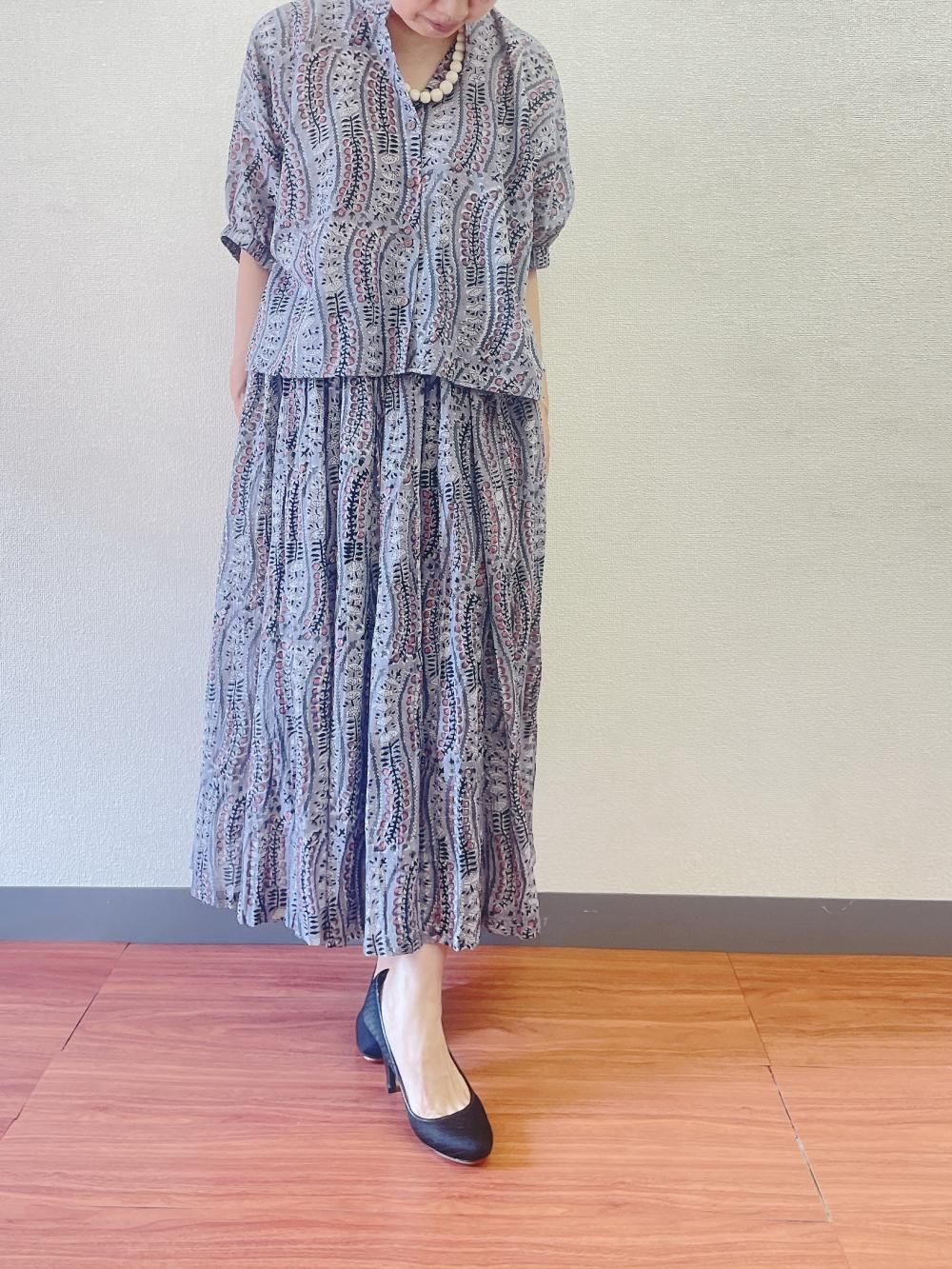 myM ブロックプリントスカートは、職人の手作業で染めていく独特のブロックプリントが特徴。
